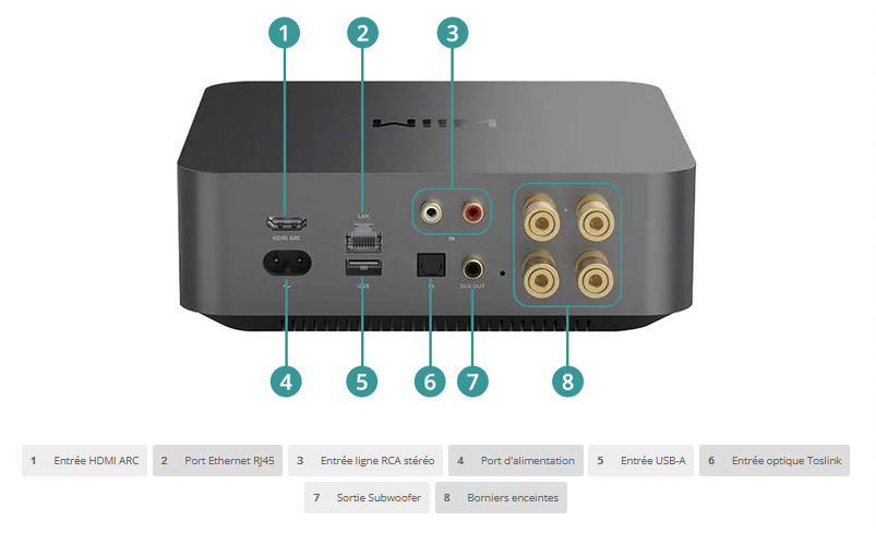 Am Eingang befinden sich USB, HDMI ARC, optischer Toslink sowie Cinch, am Ausgang Lautsprecherklemmen und ein Subwoofer-Ausgang, der die Integration des WiiM Amp Pro in ein 2.1-Kanal-System für ein immersives TV- oder Heimkino-Erlebnis ermöglicht.
